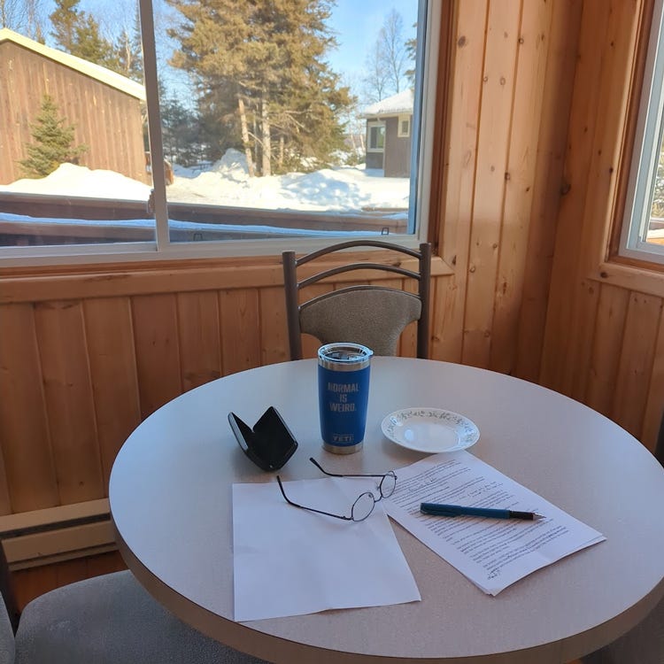 Sounded like it was something worth trying. So, I printed off a scene from my novel WIP I am particularly happy with, and took it to the living room to read. Then, I took it to a coffee shop. The weekend before last, I took it with me to the Laughing Foxes Writing Retreat, and read it over coffee while looking at Marie Louise Lake in Sleeping Giant Provincial Park.